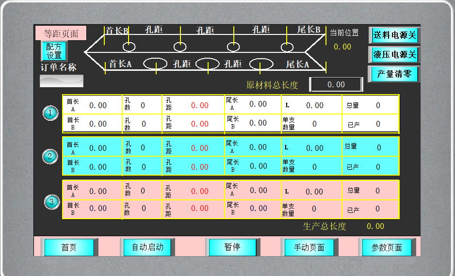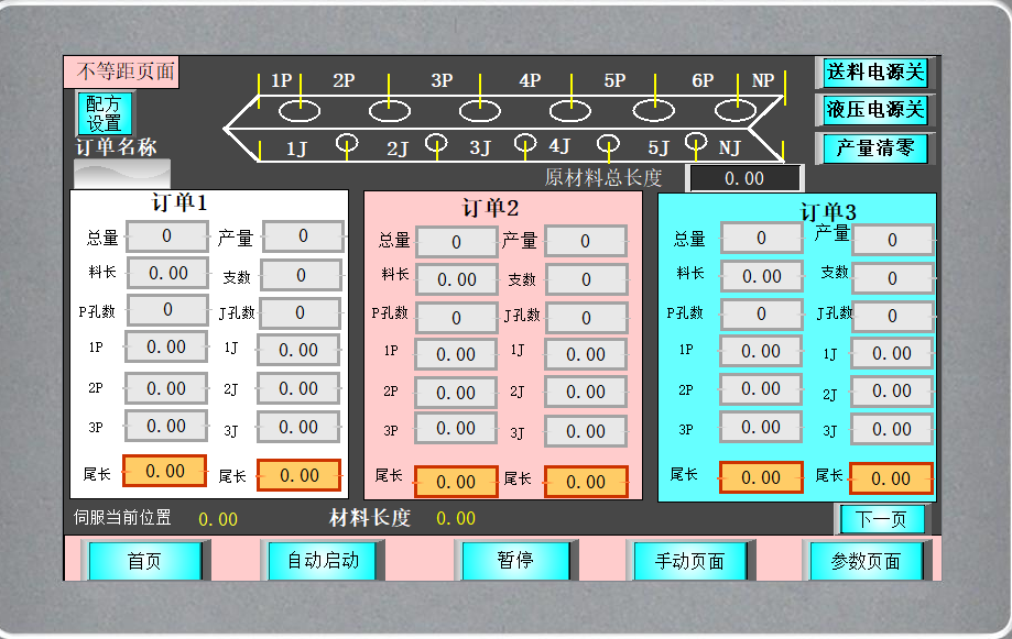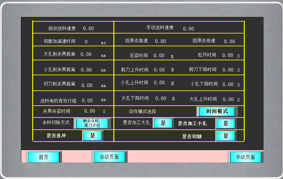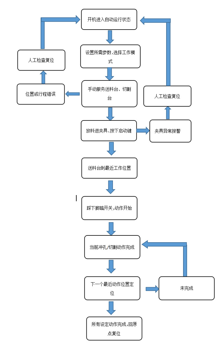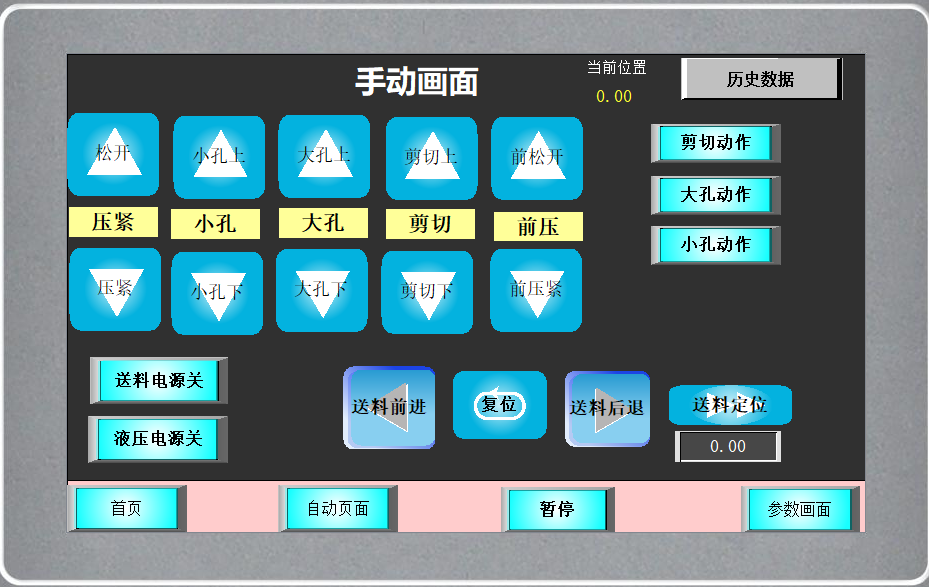 4、 输入:12路数字量输入:外部按钮开关、限位开关、磁性开关、光电传感器等。 5、 输出:13路数字量输出。其中1路高速脉冲输出。 三、工艺说明 1、设置好参数,选择等距孔位或者不等距孔位模式 2、复位,伺服先回原点准备 3、按下启动按钮,伺服送料前进 4、按该位置的动作的需求,动作冲孔/切割。 5、循环,把设置的孔数冲完,段数切割完毕 6、动作完成,自动复位回原点。