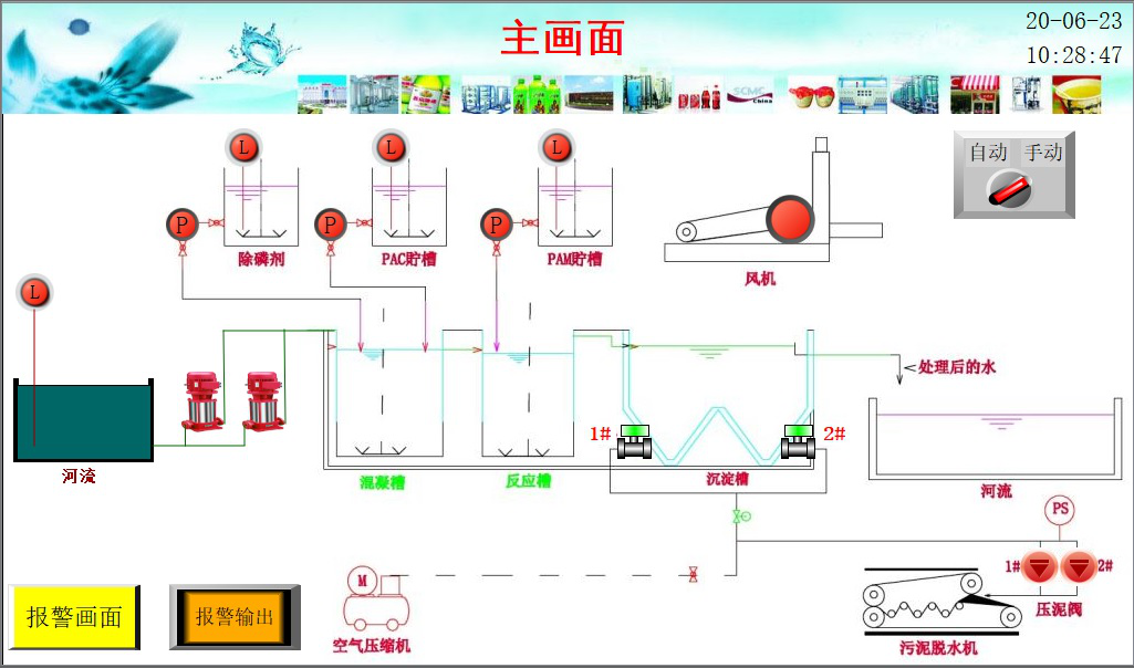 Samkoon的触摸屏和PLC在污水处理中的应用发表时间:2023-05-15 10:22 系统概述 随着社会经济的不断发展,城镇化进程的推进,污水处理已成为城镇建设的重要组成部分,生活污水工业用水等污水处理设施维护巡检周期比较长,不能随时掌握各污水处理节点排放的情况的问题也随之产生。由于污染源的数量多且分布广,这也使污水处理有了一定的局限性,使污水处理企业对管理水平的要求、对成本控制的要求在不断提升,污水处理远程监控系统应运而生。方案概述: 污水处理沉淀池监控主要包括提升泵、加药、污泥处理、风机、推流器等工艺过程的监控,要求能够实现远程操作控制。系统配置: 沉降池案例1配置HMI:PLC:采用显控云2.0远程监控沉降池案例2配置HMI:PLC:采用显控云2.0远程监控沉降池案例3配置HMI:PLC:扩展:扩展:采用局域网远程监控工艺流程: 污水处理沉降池是应用沉淀作用去除水中悬浮物的一种构筑物,净化水质的设备。一般是在生化前或生化后泥水分离的构筑物,多为分离颗粒较细的污泥。在生化之前的称为初沉池,沉淀的污泥无机成分较多,污泥含水率相对于二沉池污泥低些。位于生化之后的沉淀池一般称为二沉池,多为有机污泥,污泥含水率较高。沉降池工艺流程需要根据不同水质要求而变化。1. |
